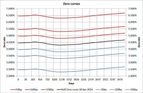 Using the 30 April 2024 AUD zero curve as an example, the chart below shows the actual zero curve plus the alternative yield curves that are applied to the swap portfolio: